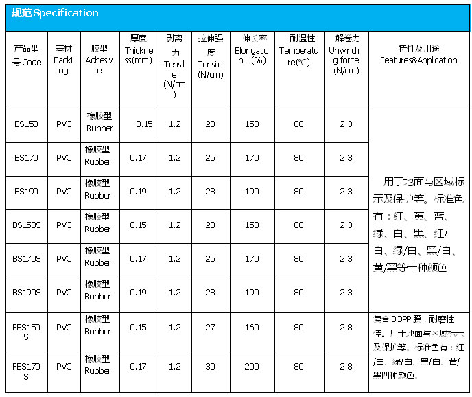 有黑、黃或紅、白線條多種款式可供選擇;表層耐磨損,能承受高流量腳踏;粘性佳,一定的防腐、耐酸堿性能,防磨損。
