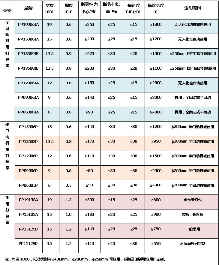 聚丙烯(PP)為主要原料。適用于各行各業(yè)的各種打包機(半自動打包機、全自動打包機、手工打包機)。粘力特強,拉力大,質(zhì)量輕、耐腐蝕,外表美觀。新產(chǎn)品質(zhì)量符合塑料打包帶GB12023-89標準。色澤鮮艷,有多種顏色,任君選擇??筛鶕?jù)客戶要求和樣品,生產(chǎn)印字(圖標)、壓字(圖標)等特殊防偽效果的打包帶。